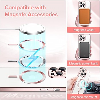 Tento luxusní křišťálový kryt se pyšní průhledným zadním panelem, který nechává vyniknout originální design vašeho iPhonu 12 Pro. Okraje krytu a precizní rámeček kolem fotoaparátu jsou vyvedeny v elegantním růžovém metalickém odstínu, který dodává celku sofistikovaný a moderní vzhled. Integrovaná technologie MagSafe je zvýrazněna kruhovým prvkem a zarovnávacím magnetem ve stejném růžovém metalickém provedení, což zajišťuje perfektní kompatibilitu s MagSafe příslušenstvím a bezdrátovým nabíjením. Díky kombinaci odolných materiálů a precizního zpracování poskytuje kryt spolehlivou ochranu proti pádům, poškrábání a každodennímu opotřebení, aniž by přidával zbytečný objem.