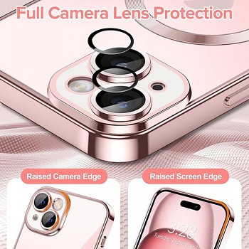 Design pouzdra je promyšlen do posledního detailu. Zadní strana je křišťálově průhledná, což umožňuje vyniknout kráse vašeho iPhonu. Okraje pouzdra a výrazný MagSafe kroužek jsou vyvedeny v luxusním růžovém metalickém odstínu, který dodává celku sofistikovaný a moderní vzhled. Stejné růžové akcenty najdete i kolem precizních výřezů pro fotoaparáty, což vytváří harmonický a ucelený dojem. Integrovaný MagSafe kroužek zajišťuje perfektní kompatibilitu s MagSafe příslušenstvím a bezdrátovým nabíjením.