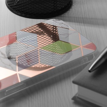 Design pouzdra zaujme na první pohled svým sofistikovaným geometrickým vzorem. Zadní strana je zdobena mozaikou šestiúhelníků, které kombinují luxusní vzhled bílého mramoru s jemnými šedými a načervenalými žilkami, doplněné o pastelové odstíny světle růžové, měděné a decentní světle zelené. Tento moderní a zároveň nadčasový vzor dodává vašemu zařízení jedinečný a stylový vzhled. Pouzdro je navrženo s precizním kruhovým výřezem pro modul fotoaparátu, který dokonale kopíruje linie telefonu a zajišťuje jeho plnou funkčnost. Průhledné okraje pouzdra pak nechávají vyniknout původní design telefonu.