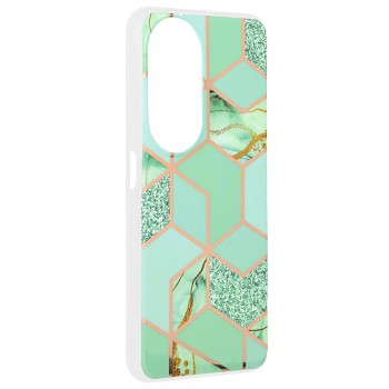 Pouzdro se pyšní unikátním geometrickým vzorem, který kombinuje odstíny svěží zelené s luxusními detaily v barvě růžového zlata. Vzor je tvořen šestiúhelníky a dalšími geometrickými tvary, které vytvářejí moderní a sofistikovaný dojem. Některé segmenty vzoru jsou obohaceny o jemný třpytivý efekt, zatímco jiné imitují texturu mramoru s decentními zlatými žilkami, což dodává pouzdru punc originality a exkluzivity. Průhledné okraje pouzdra pak nechávají vyniknout původní design vašeho telefonu a zároveň zajišťují komplexní ochranu.