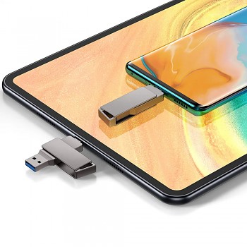 Design paměťového disku Techsuit THSM19 se vyznačuje minimalistickým a moderním vzhledem. Tělo disku je vyrobeno z odolného kovu v elegantní šedé barvě, což mu dodává prémiový vzhled a zároveň zajišťuje vysokou odolnost proti poškození. Klíčovým prvkem je inovativní duální rozhraní, které umožňuje snadné přepínání mezi konektory USB 3.0 a USB-C. Díky otočnému mechanismu lze jeden konektor elegantně skrýt, zatímco druhý je připraven k použití, což chrání konektory před prachem a poškozením a zároveň udržuje kompaktní tvar disku. Logo značky Techsuit je decentně umístěno na těle disku, což podtrhuje jeho sofistikovaný vzhled.