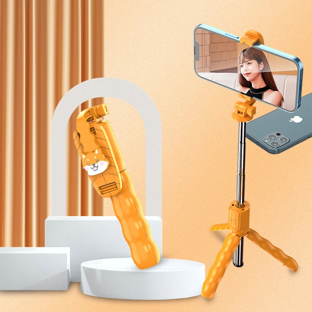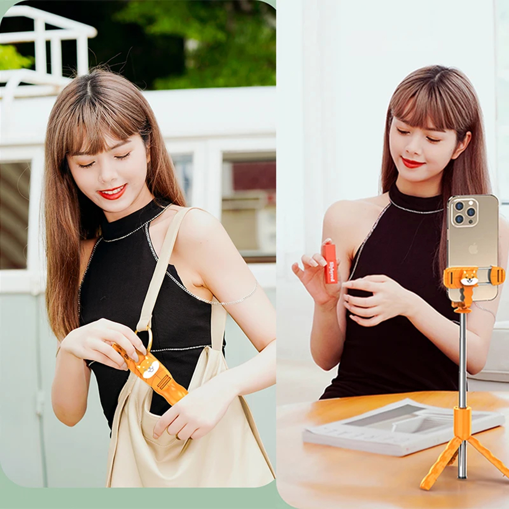 Design selfie tyče KT01 je promyšlený do posledního detailu. V složeném stavu se pyšní kompaktními rozměry a ergonomicky tvarovanou rukojetí s vlnitým povrchem, která zajišťuje pohodlné a pevné držení. Dominantním prvkem je roztomilý motiv obličeje psa Shiba Inu, který zdobí odnímatelné dálkové ovládání, jež je elegantně integrováno do těla tyče. Dálkové ovládání umožňuje fotografování jedním kliknutím, což výrazně usnadňuje pořizování snímků.