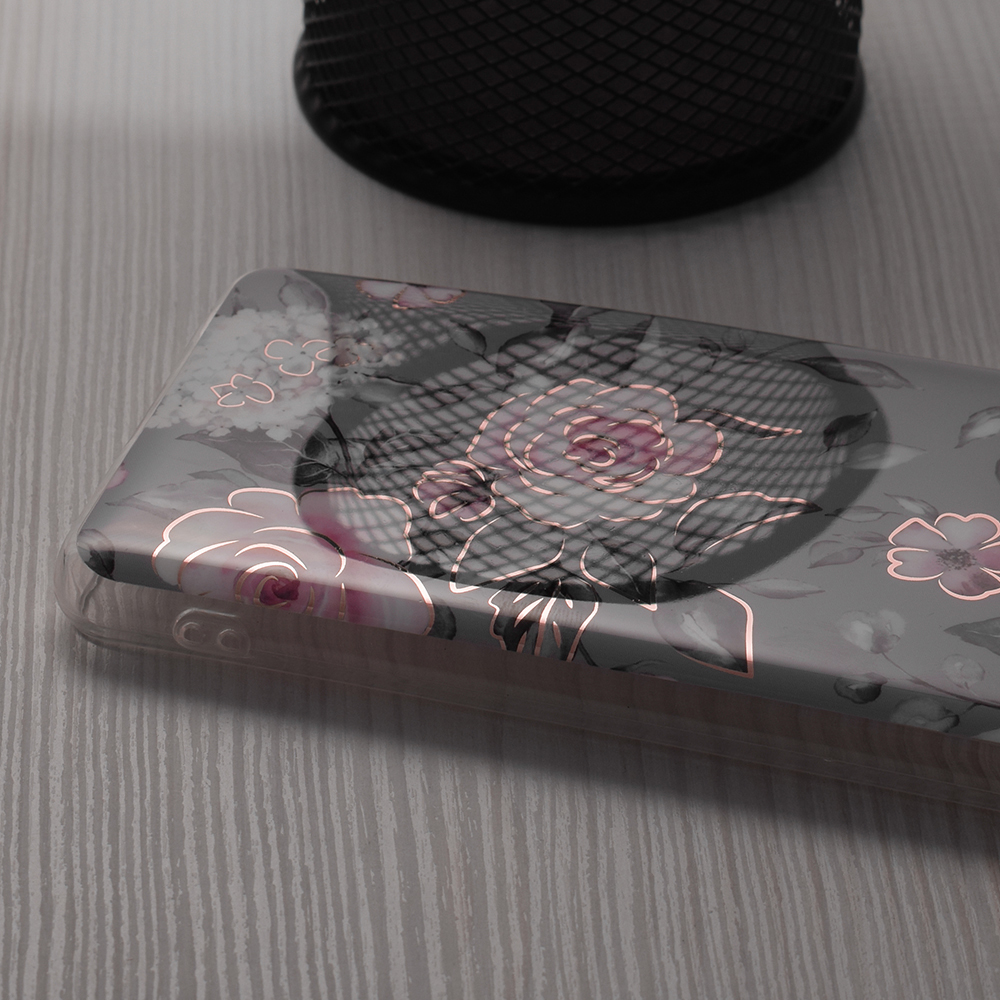 Pouzdro se pyšní sofistikovaným designem s jemným šedým podkladem, který je zdoben nádhernými květy. Dominantou jsou elegantní růže v odstínech růžové, doplněné o decentní metalické nebo růžově zlaté obrysy, které dodávají designu luxusní nádech. Celek je harmonicky doplněn menšími bílými květy, připomínajícími hortenzie, a šedými listy, vytvářejícími ucelený a vkusný květinový vzor. Průhledné boky pouzdra nechávají vyniknout původní barvu vašeho telefonu, zatímco precizní kruhový výřez na zadní straně je dokonale přizpůsoben pro modul fotoaparátu Honor Magic6 Lite.