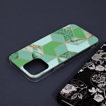 Design pouzdra zaujme na první pohled svým moderním geometrickým vzorem. Skládá se z hexagonálních tvarů, které jsou vyplněny různými texturami a odstíny zelené barvy. Některé segmenty se pyšní luxusním mramorovým vzhledem s jemnými zlatavými žilkami, zatímco jiné září třpytivým zeleným efektem, který dodává pouzdru dynamiku a šmrnc. Celkový dojem doplňují čisté, zlatavé linie, jež precizně oddělují jednotlivé šestiúhelníky a vytvářejí tak harmonický a sofistikovaný celek. Pouzdro je vyrobeno z pružného materiálu, který se snadno nasazuje a poskytuje spolehlivou ochranu proti nárazům a poškrábání.