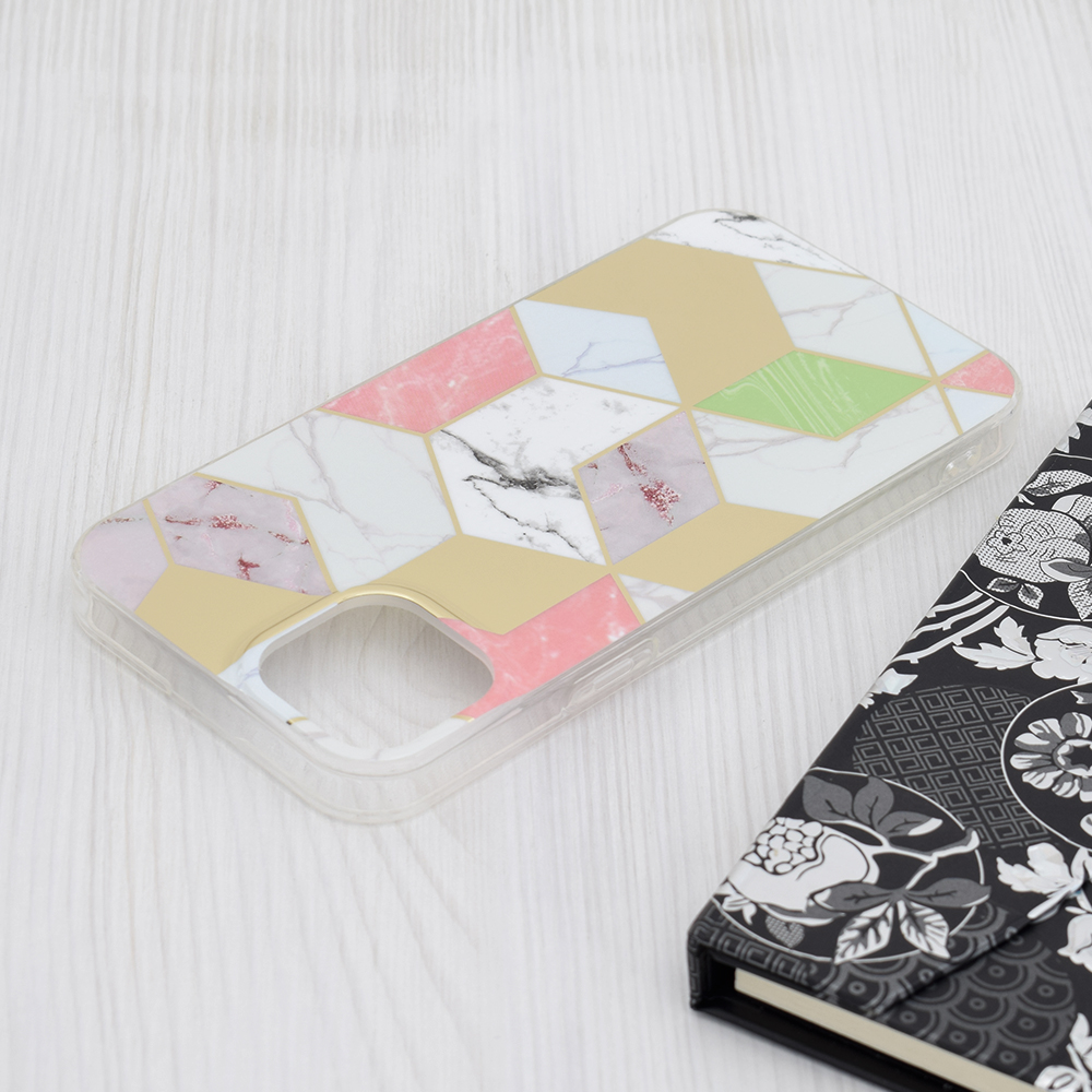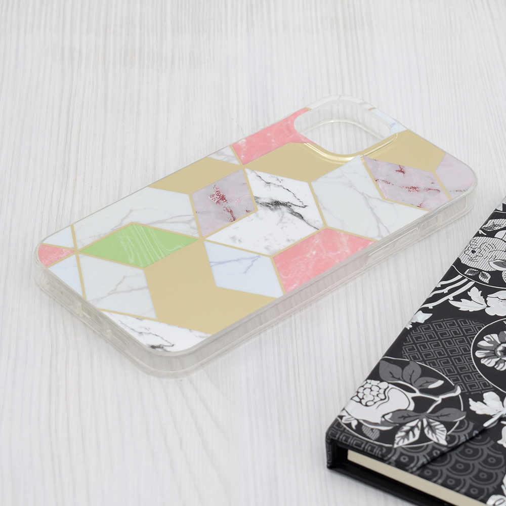 Toto pouzdro se pyšní unikátním designem s geometrickým vzorem, který tvoří elegantní šestiúhelníky. Vzor kombinuje různé textury mramoru v odstínech bílé, jemně růžové a světle zelené, doplněné o zlaté šestiúhelníkové plochy. Celý design je podtržen tenkými zlatými linkami, které zvýrazňují hrany jednotlivých segmentů a dodávají pouzdru luxusní vzhled. I přes název "Purple Hex" v produktovém označení, vizuální provedení na obrázku přináší svěží paletu barev, která oživí váš telefon. Pouzdro je vyrobeno z pečlivě vybraných a zdravotně nezávadných materiálů, což zaručuje jeho dlouhou životnost a odolnost proti každodennímu opotřebení.
