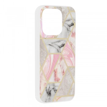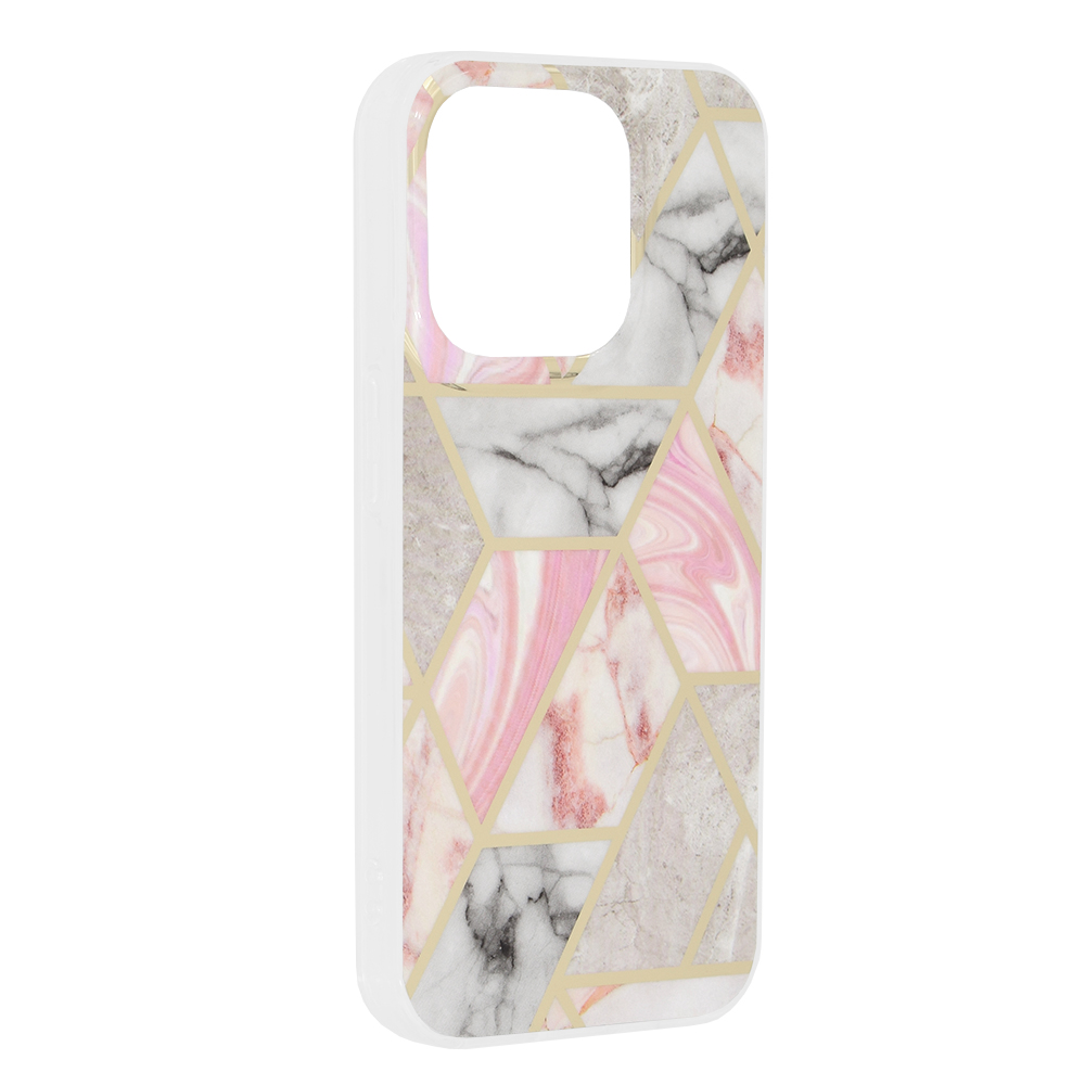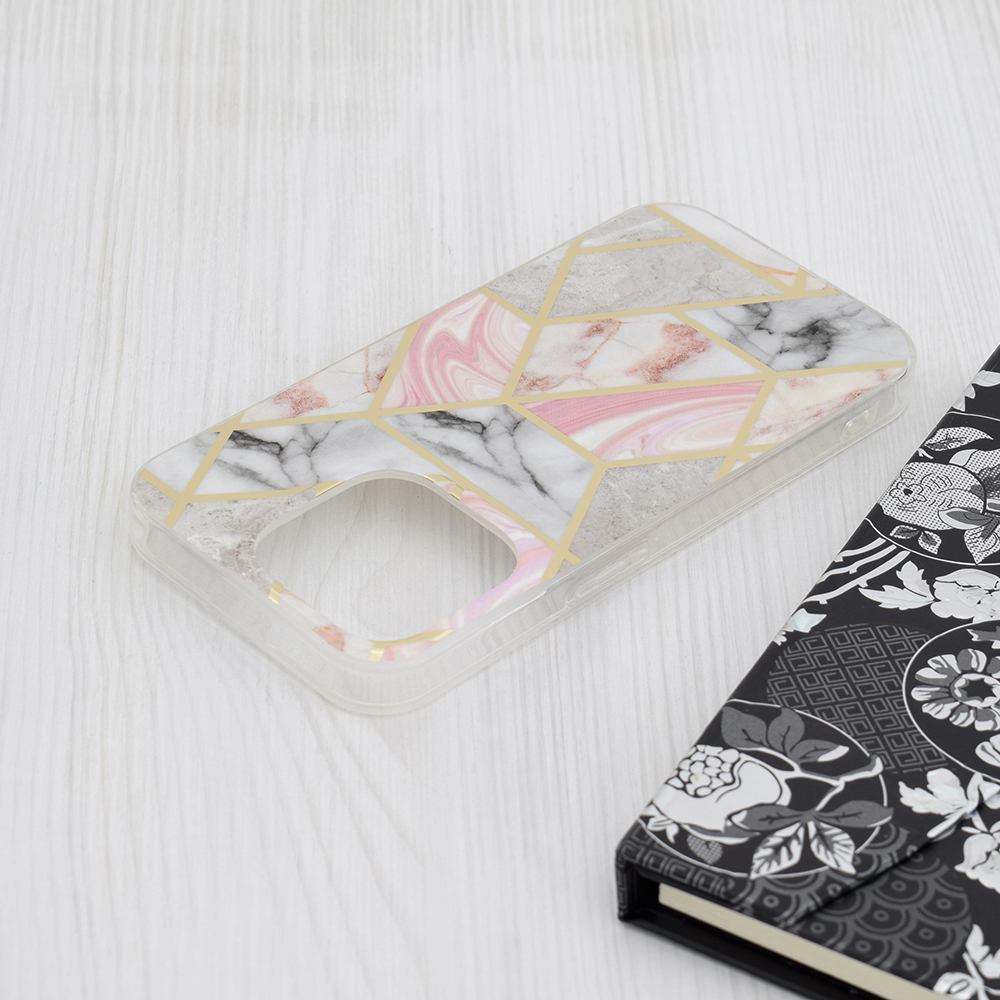 Pouzdro Techsuit Marble Series pro iPhone 15 Pro v provedení Pink Hex zaujme svým moderním a elegantním designem. Povrch krytu zdobí sofistikovaný geometrický vzor tvořený šestiúhelníky a dalšími polygonálními tvary, které jsou precizně ohraničeny tenkými liniemi v barvě metalického zlata. Uvnitř těchto tvarů se střídají mramorové textury v odstínech bílé, světle šedé a výrazných vírů jemné růžové a načervenalé barvy. Tento design dodává telefonu luxusní vzhled a zároveň zajišťuje spolehlivou ochranu před poškrábáním a nárazy.