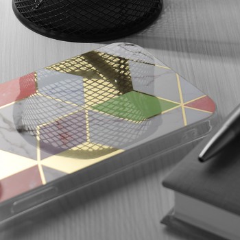 Pouzdro se pyšní sofistikovaným geometrickým vzorem, který kombinuje prvky luxusního mramoru v odstínech bílé a růžové s elegantními zlatými plochami a jemnými zelenými akcenty. Celý design je ohraničen tenkými zlatými liniemi, které vytvářejí dojem moderního uměleckého díla. I přes název "Fialový Hex" se v mramorových žilách objevují decentní tmavší tóny, které dodávají celku hloubku a šmrnc. Průhledné boky pouzdra navíc nechají vyniknout původní barvu vašeho telefonu, zatímco zadní strana s výrazným vzorem upoutá pozornost.
