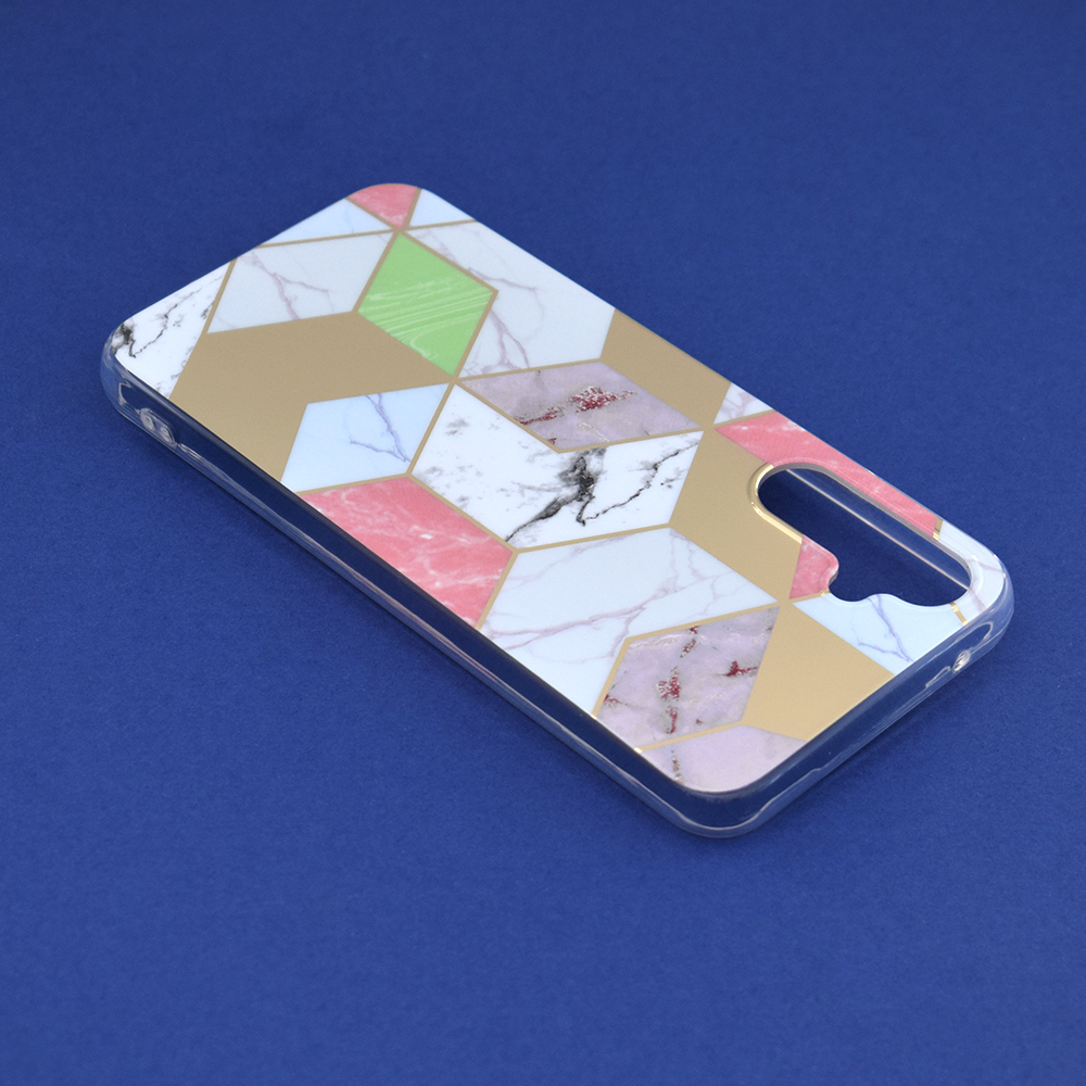 Design pouzdra zaujme na první pohled svým moderním geometrickým vzorem, který kombinuje šestiúhelníky a kosočtverce. Tyto tvary jsou vyplněny elegantními mramorovými texturami v odstínech fialové, růžové, bílé a světle zelené, doplněné o luxusní zlaté plochy. Celkový vzhled je sofistikovaný a poutavý, ideální pro ty, kteří hledají originální a zároveň elegantní doplněk.
