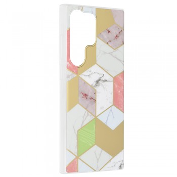 Design a styl: Pouzdro se pyšní moderním mramorovým designem s geometrickými tvary šestiúhelníků, které jsou uspořádány do elegantního vzoru. Barevná paleta zahrnuje odstíny fialové, růžové, zelené a zlaté, doplněné o klasickou bílou mramorovou texturu, což vytváří sofistikovaný a poutavý vzhled. Zlaté linie mezi jednotlivými segmenty dodávají pouzdru luxusní nádech a podtrhují jeho jedinečnost.