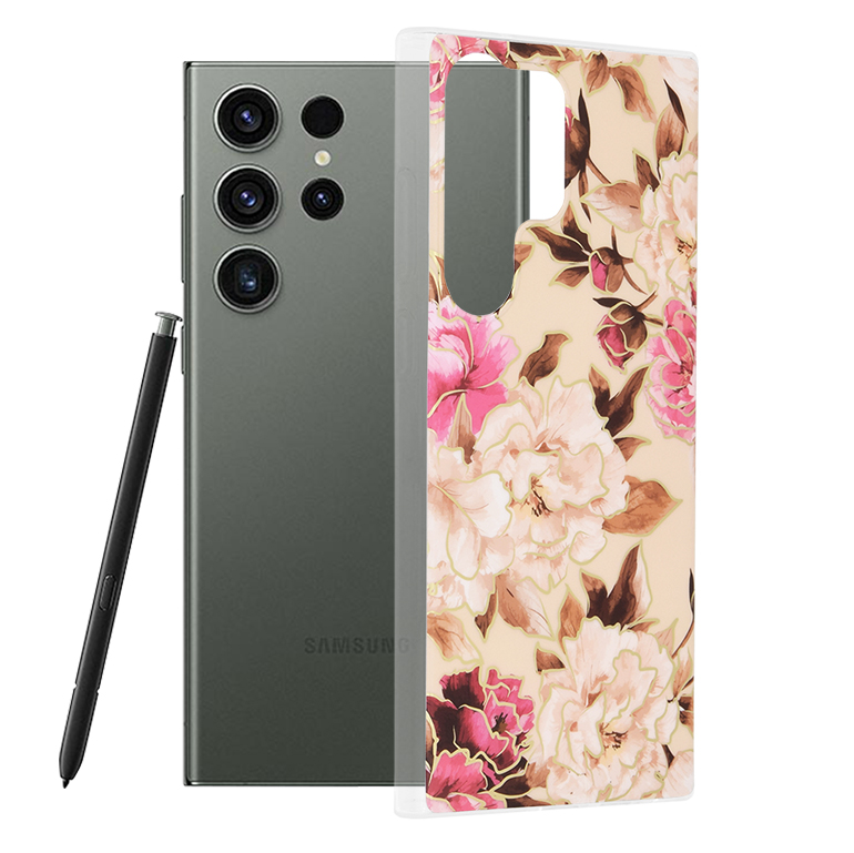Design pouzdra se vyznačuje jemným béžovým podkladem, na kterém rozkvétají nádherné květinové motivy v odstínech růžové, bordó a krémové barvy. Kontury květů jsou decentně zvýrazněny zlatavými linkami, které dodávají celému vzhledu punc luxusu a sofistikovanosti. Tento design je ideální pro ty, kteří hledají kombinaci elegance, ženskosti a moderního vzhledu.