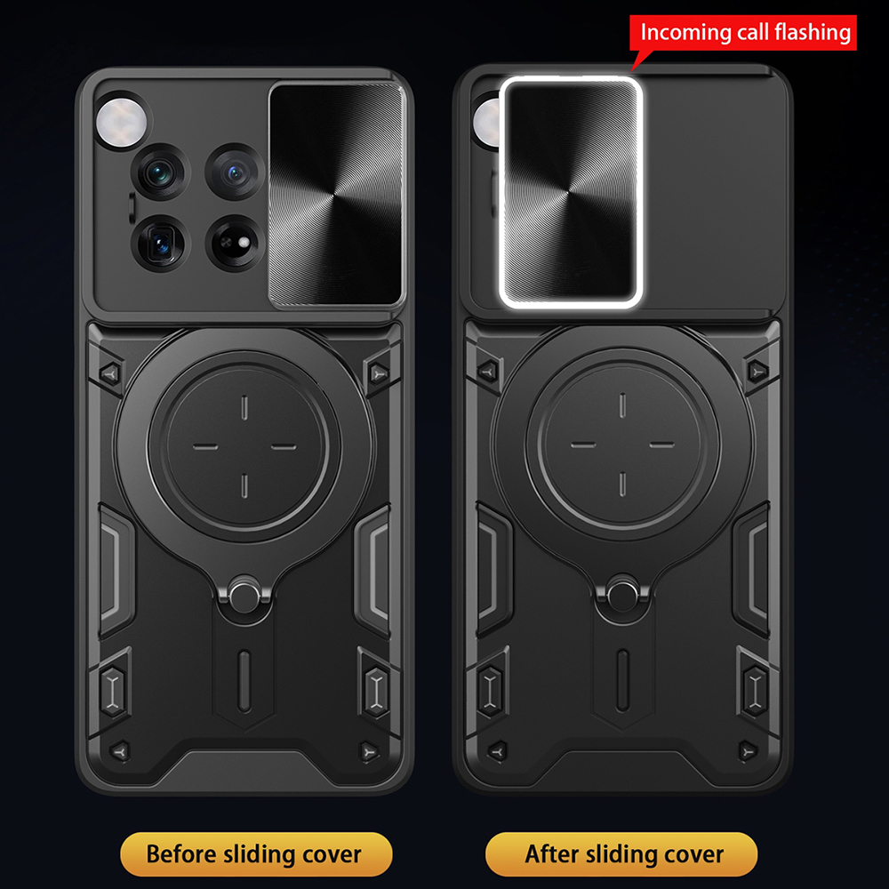 Kryt Techsuit CamGuard Pro se pyšní robustním a moderním designem, který podtrhuje odolnost a spolehlivost. Jeho černá barva s tmavě šedými a kovovými akcenty dodává telefonu sofistikovaný vzhled. Klíčovým prvkem je integrovaná posuvná ochrana kamery s texturou broušeného kovu, která efektivně chrání citlivé objektivy před poškrábáním a nárazy, když je nepoužíváte. Na zadní straně naleznete také praktický kovový kroužek, který slouží jako bezpečný úchyt pro lepší manipulaci s telefonem nebo jako stabilní stojánek pro pohodlné sledování obsahu. Precizní výřezy zajišťují bezproblémový přístup ke všem portům, tlačítkům a funkcím telefonu, včetně mikrofonů a reproduktorů, což zaručuje, že používání vašeho OnePlus 12 zůstane vždy komfortní a intuitivní.