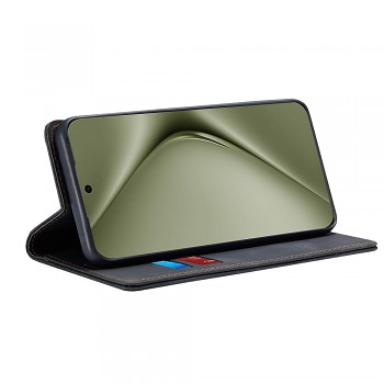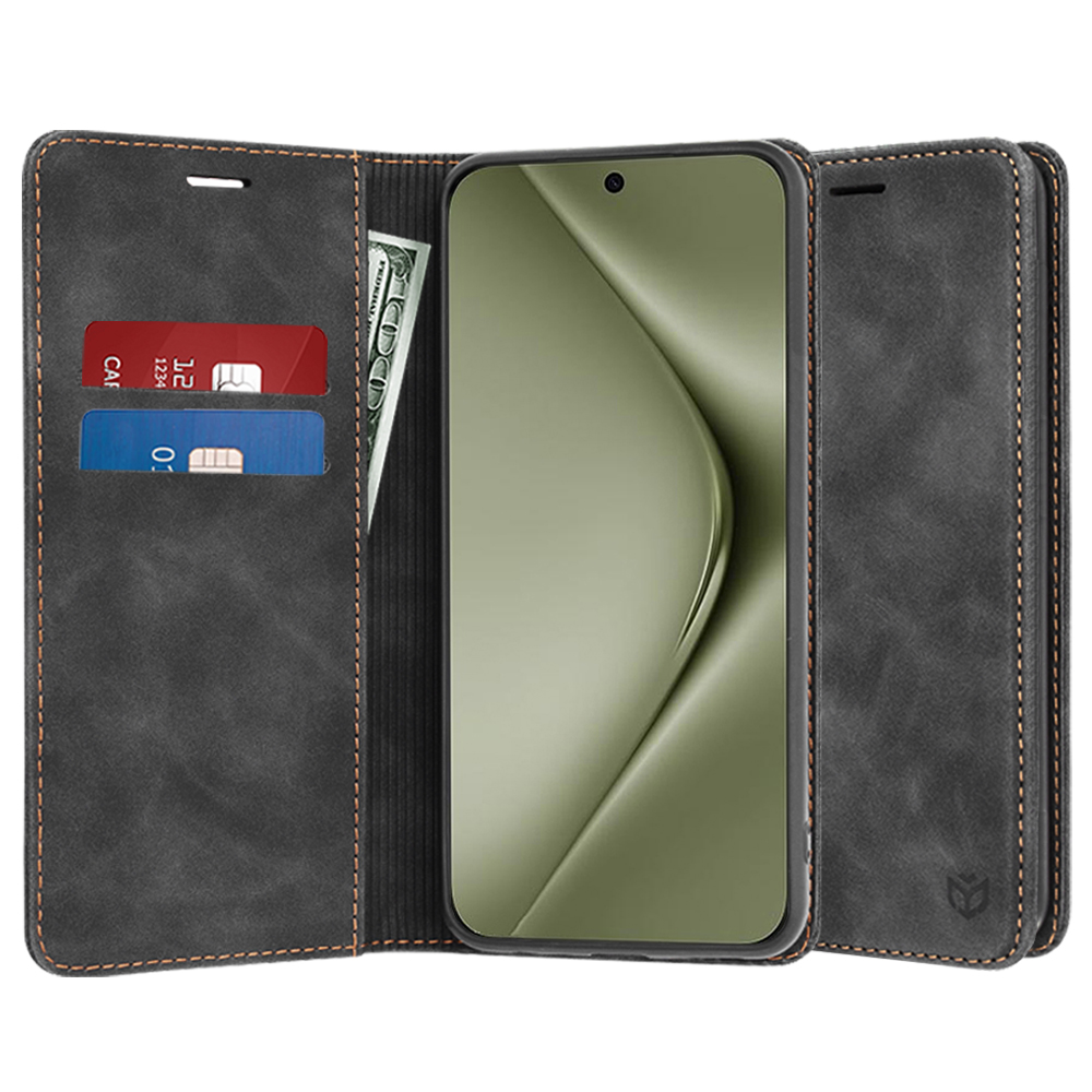 Kryt Techsuit Confy Cover pro Huawei Pura 70 Ultra v elegantní černé barvě je navržen jako praktické pouzdro typu kniha, které poskytuje komplexní ochranu. Jeho povrch se vyznačuje jemnou texturou, která připomíná broušenou kůži, což dodává pouzdru sofistikovaný a zároveň robustní vzhled. Výrazné oranžovo-hnědé prošívání podél okrajů nejen zpevňuje konstrukci, ale také vytváří atraktivní kontrast a podtrhuje precizní zpracování. Uvnitř pouzdra naleznete praktické přihrádky na platební karty a větší kapsu na bankovky, což z něj činí ideálního společníka pro každodenní nošení. Telefon je bezpečně usazen v černém vnitřním rámu, který zajišťuje jeho stabilitu a ochranu před nárazy.