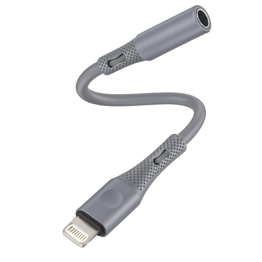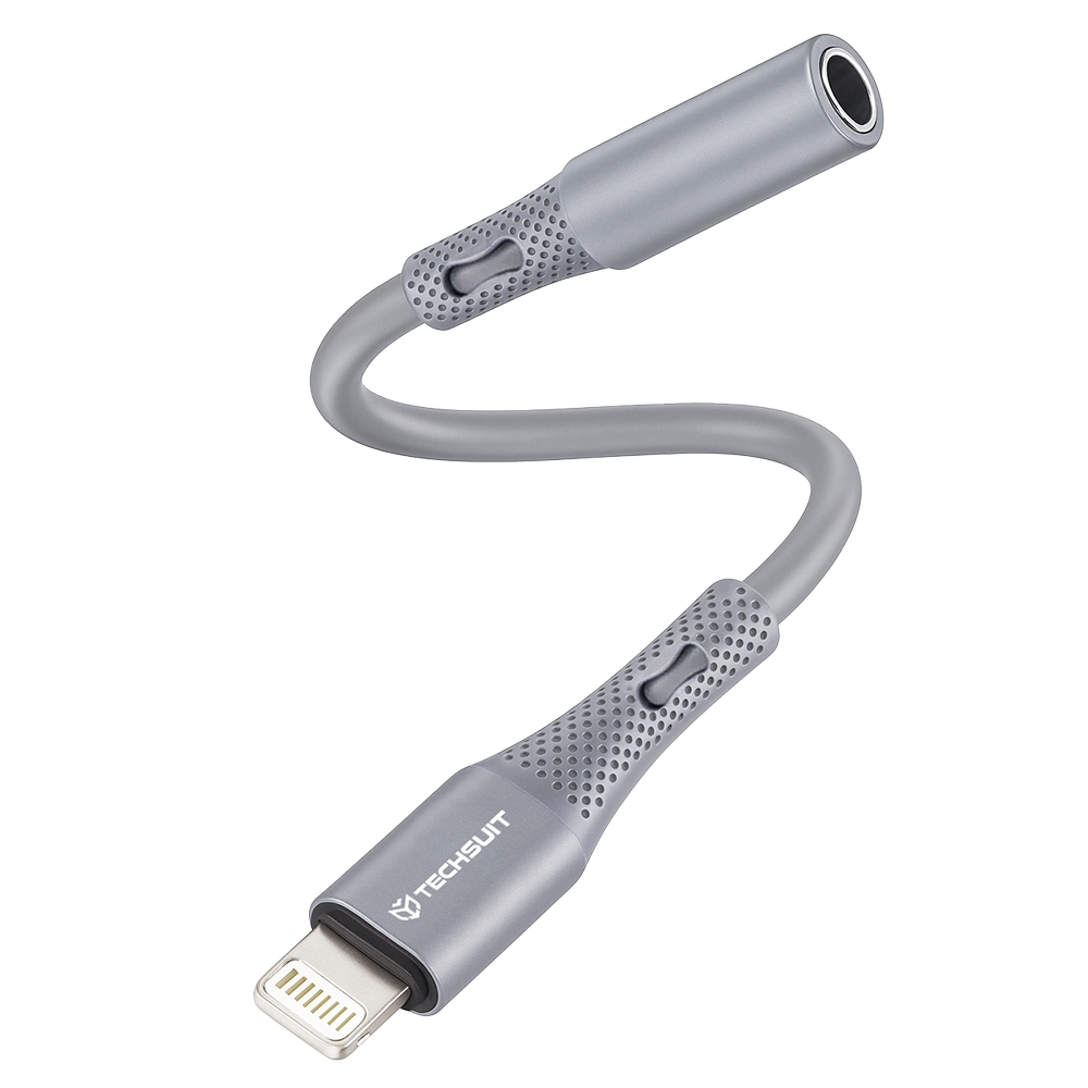 Adaptér SoundFleX AC2 se pyšní elegantním a funkčním designem v moderní šedé barvě. Jeho tělo je vyrobeno z odolného silikonu, který zajišťuje výjimečnou flexibilitu a dlouhou životnost. Kabel je navržen tak, aby odolával každodennímu opotřebení, zamotání a ohýbání. Koncovky adaptéru, jak Lightning, tak 3.5mm jack, jsou zpevněny a opatřeny protiskluzovou texturou s perforací, která nejenže dodává adaptéru sofistikovaný vzhled, ale také usnadňuje manipulaci a zajišťuje pevné uchopení. Logo Techsuit je decentně umístěno na Lightning konektoru, což podtrhuje prémiový charakter produktu.