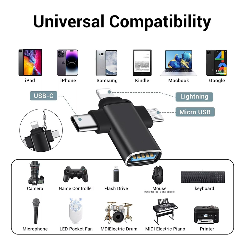 S Techsuit Premium OTG adaptérem SoundVoltX A17 4v1 můžete připojit USB flash disky, externí klávesnice, myši, herní ovladače nebo dokonce nabíjet svůj telefon, zatímco posloucháte hudbu přes klasická sluchátka. Rozšiřte možnosti svého telefonu a užijte si maximální flexibilitu!
