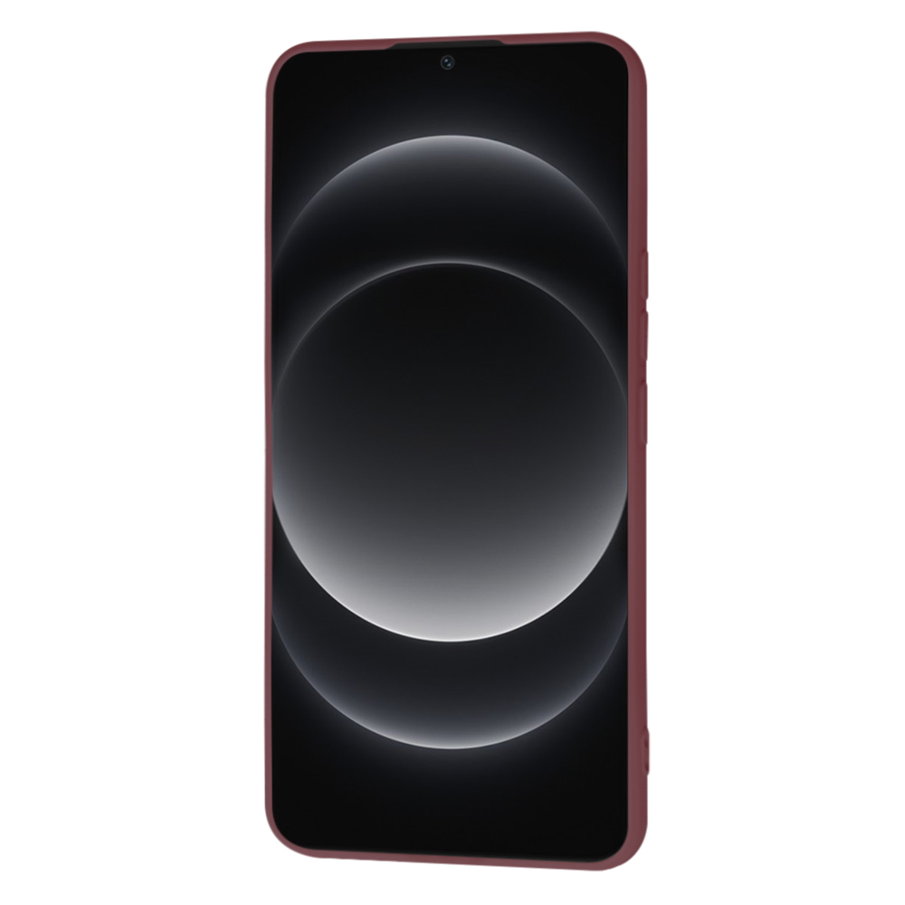 Pouzdro je vyrobeno z kvalitního, měkkého a matného materiálu, pravděpodobně TPU nebo silikonu, který je příjemný na dotek a zajišťuje pevný úchop, čímž minimalizuje riziko vyklouznutí telefonu z ruky. Jeho minimalistický design podtrhuje přirozené linie telefonu, zatímco švestkově červený odstín dodává zařízení sofistikovaný a moderní vzhled. Na zadní straně je precizně zpracovaný velký kruhový výřez, který dokonale obepíná rozměrný modul fotoaparátu Xiaomi 14 Ultra, včetně všech čtyř objektivů, blesku a senzorů, a zajišťuje tak jejich plnou funkčnost a ochranu. Zvýšené okraje kolem displeje a fotoaparátu poskytují dodatečnou ochranu proti poškrábání při položení telefonu na rovný povrch.