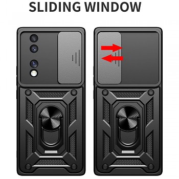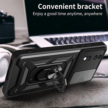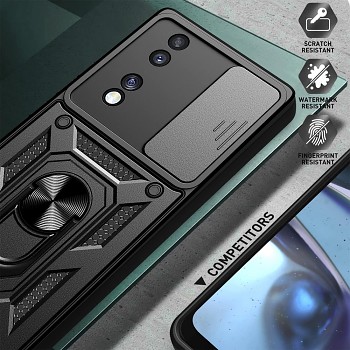 Pouzdro Techsuit CamShield Series pro Honor 70 v elegantní černé barvě je navrženo s důrazem na maximální ochranu a praktičnost. Jeho robustní konstrukce kombinuje pevný polykarbonát a pružný TPU, což zajišťuje vysokou odolnost proti nárazům a pádům. Dominantním prvkem je integrovaný posuvný kryt fotoaparátu, který efektivně chrání čočky před poškrábáním a nečistotami, a zároveň poskytuje soukromí. Zadní strana pouzdra disponuje texturovaným povrchem pro lepší úchop a moderní vzhled, doplněným o integrovaný kovový kroužek, který slouží jako stojánek pro pohodlné sledování obsahu nebo jako bezpečný úchyt. Zesílené rohy a zvýšené okraje kolem displeje poskytují dodatečnou ochranu proti poškození při položení telefonu na rovnou plochu.