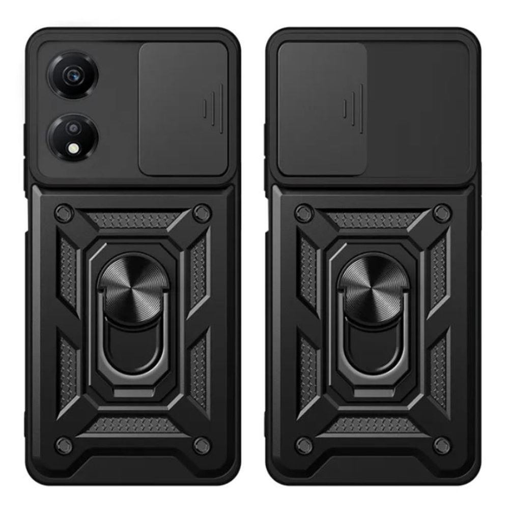 Design pouzdra je inspirován taktickým vzhledem, s výraznými geometrickými liniemi a texturovanými povrchy, které nejen skvěle vypadají, ale také zlepšují úchop a minimalizují riziko vyklouznutí telefonu z ruky. Dominantním prvkem je integrovaný posuvný kryt fotoaparátu, který efektivně chrání čočky před poškrábáním a nečistotami, když nejsou používány. Na zadní straně pouzdra se nachází také otočný prstenec, který slouží jako praktický stojánek pro sledování obsahu nebo jako bezpečný úchyt pro stabilnější držení telefonu.
