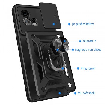 Design pouzdra Techsuit CamShield Series je navržen s důrazem na maximální odolnost a praktičnost. Pouzdro v elegantní černé barvě se pyšní robustním vzhledem s texturovanými prvky a zesílenými rohy, které efektivně absorbují nárazy a chrání telefon před poškozením. Klíčovým prvkem je integrovaný posuvný kryt fotoaparátu, který zajišťuje dokonalou ochranu objektivů před poškrábáním a nečistotami, a zároveň chrání vaše soukromí. Na zadní straně naleznete také praktický kovový kroužek, který slouží jako stojánek pro pohodlné sledování obsahu nebo jako bezpečný úchyt pro pevnější držení telefonu.