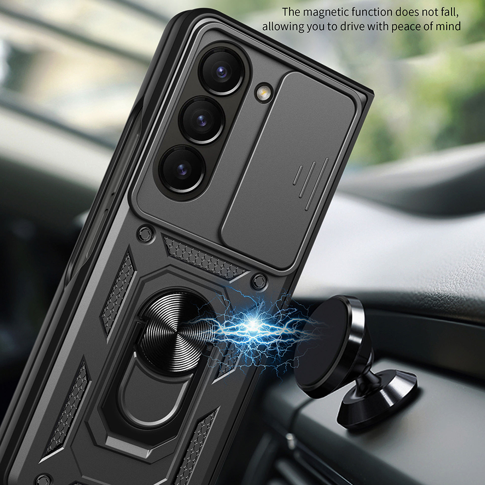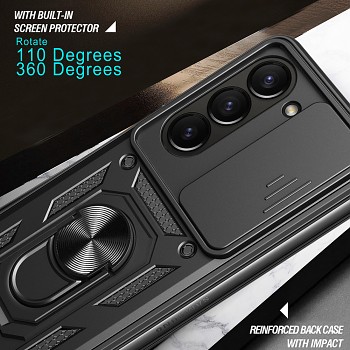 Jednou z klíčových vlastností je integrovaný posuvný kryt CamShield, který efektivně chrání citlivé objektivy fotoaparátu před poškrábáním a nečistotami, když je nepoužíváte. Dalším praktickým prvkem je otočný prstenec na zadní straně, který slouží jako stabilní stojánek pro pohodlné sledování obsahu v horizontální poloze. Tento prstenec má navíc magnetickou funkci, což umožňuje snadné a bezpečné uchycení telefonu do kompatibilních magnetických držáků, například v automobilu. Pouzdro je navrženo s vyztuženou zadní částí pro zvýšenou odolnost proti nárazům a obsahuje vestavěnou ochranu displeje.