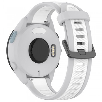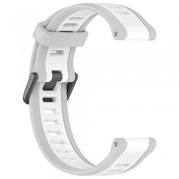 Řemínek Techsuit W053 se pyšní moderním a sportovně-elegantním designem v čistě bílé barvě, která je doplněna o decentní světle šedé prvky, vytvářející zajímavý dvoubarevný efekt. Je vyroben z vysoce kvalitního silikonu, který je příjemný na dotek, odolný vůči potu a vodě, a zároveň velmi flexibilní. Vnitřní strana řemínku a části vnějšího povrchu jsou opatřeny jemnou texturou, která zajišťuje lepší prodyšnost a zabraňuje klouzání na zápěstí. Zapínání je řešeno klasickou kovovou přezkou v tmavě šedé až černé barvě, která zaručuje bezpečné a snadné upevnění.
