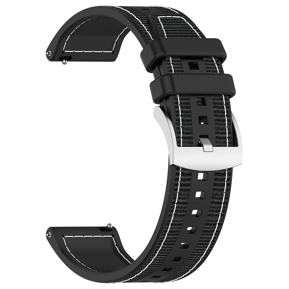 Řemínek Techsuit se pyšní sofistikovaným designem, který kombinuje sportovní eleganci s praktičností. Vnější strana řemínku je vyrobena z odolného černého textilu s jemnou strukturou, doplněnou o kontrastní bílé prošívání po okrajích, které dodává řemínku moderní a dynamický vzhled. Vnitřní strana je zhotovena z hladkého a příjemného silikonu, který zajišťuje pohodlí i při dlouhodobém nošení a je odolný vůči potu a vodě. Stříbrná spona z nerezové oceli nejenže bezpečně drží řemínek na zápěstí, ale také podtrhuje jeho prémiový charakter.