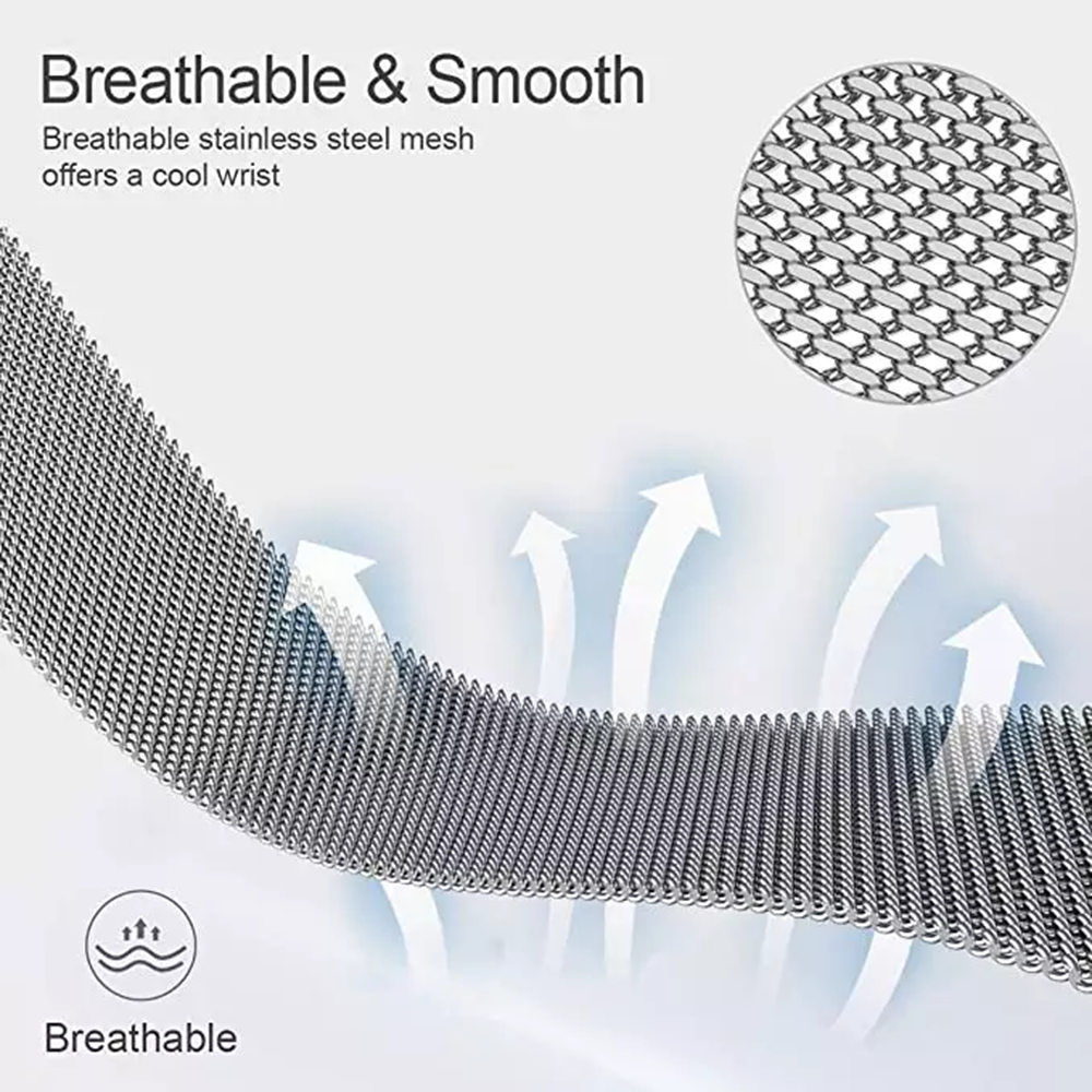 Řemínek se pyšní sofistikovaným designem milánského tahu, který je charakteristický svou jemnou, hustě pletenou kovovou síťovinou. Ta nejenže vypadá luxusně, ale je také příjemná na dotek a prodyšná. Elegantní tmavě modrá barva dodává řemínku moderní a univerzální vzhled, který se snadno kombinuje s různými outfity. Díky inovativnímu magnetickému zapínání je nasazení a úprava délky řemínku otázkou okamžiku, což zajišťuje perfektní a bezpečné uchycení na každém zápěstí.