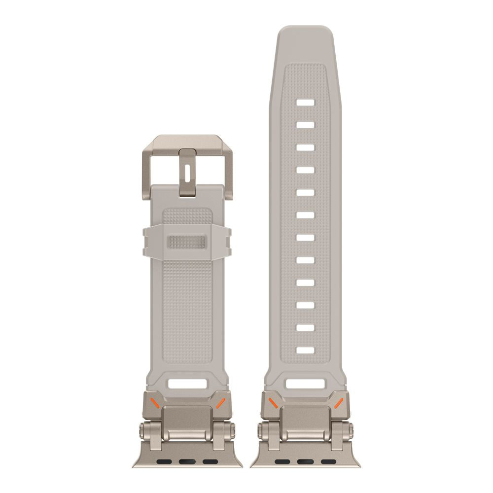 Konektory k hodinkám a spona jsou vyrobeny z lehkého a pevného titanu ve stříbrné barvě, což dodává řemínku luxusní vzhled a zvýšenou odolnost. Tyto kovové prvky jsou precizně zpracované a dokonale ladí s designem Apple Watch. Decentní oranžové akcenty na spojích mezi řemínkem a konektory přidávají sportovní a dynamický nádech.