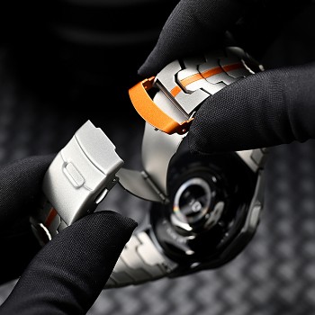 Řemínek Techsuit se pyšní moderním a robustním designem, který okamžitě upoutá pozornost. Je vyroben z kvalitního kovu v elegantní černé barvě, což mu dodává luxusní vzhled a zajišťuje dlouhou životnost. Jednotlivé články řemínku mají geometrický vzor, který vytváří zajímavou texturu a dodává celku dynamický vzhled. Zapínání je řešeno diskrétní motýlkovou sponou, která je integrována do designu řemínku a zajišťuje bezpečné a pohodlné nošení bez rušivých prvků. Vnitřní strana spony nese nápis "STAINLESS STEEL", což potvrzuje použití nerezové oceli pro maximální odolnost a komfort.