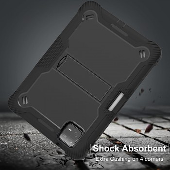 Obal Techsuit Rugged TabShell se pyšní odolnou konstrukcí, která je viditelná na první pohled. Jeho design zahrnuje zesílené rohy a zvýšené okraje kolem displeje a fotoaparátu, což efektivně chrání před poškrábáním a nárazy při položení tabletu displejem dolů. Díky tlumicím prvkům a extra polstrování ve všech čtyřech rozích je váš tablet chráněn před pády a otřesy.