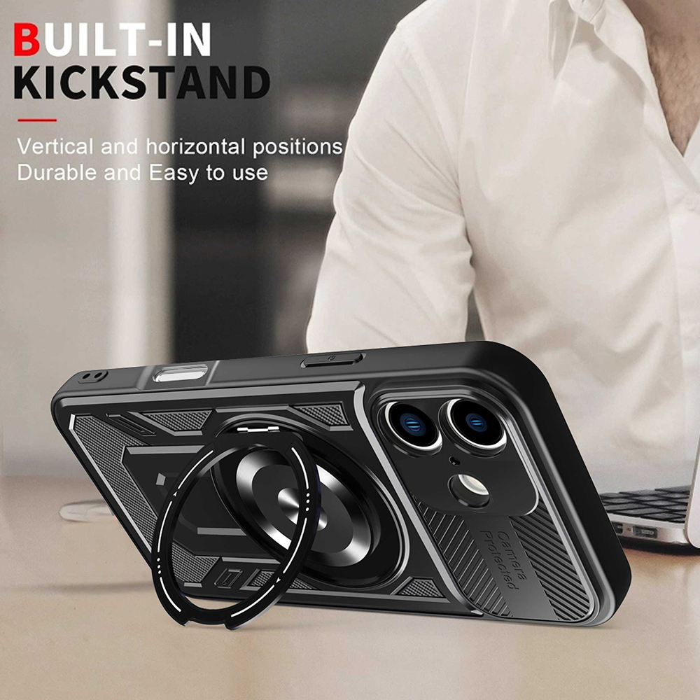 Jedním z klíčových prvků je inovativní ochrana fotoaparátu. Pouzdro disponuje posuvným krytem, který spolehlivě chrání čočky fotoaparátu před poškrábáním a nečistotami, když jej nepoužíváte. Integrovaný kovový kroužek na zadní straně slouží jako praktický stojánek pro pohodlné sledování obsahu nebo jako bezpečný úchyt pro prst. Kroužek je navíc magnetický, což umožňuje snadné připevnění telefonu k magnetickým držákům, například v automobilu.