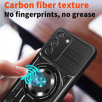 Pouzdro Techsuit RuggedCam se vyznačuje industriálním a zároveň stylovým designem. Dominantní šedá barva je doplněna o černé akcenty a textury připomínající uhlíková vlákna, což dodává pouzdru dynamický a moderní vzhled. Klíčovým prvkem je integrovaná posuvná krytka fotoaparátu s nápisem „Camera Protected“, která efektivně chrání citlivé objektivy před poškrábáním a nečistotami. Na zadní straně naleznete také praktický kovový kroužek, který slouží jako opěrka pro sledování obsahu nebo jako bezpečný úchyt pro pohodlnější manipulaci s telefonem. Tento kroužek je navíc magnetický, což umožňuje snadné připevnění k magnetickým držákům v autě. Zvýšené okraje pouzdra poskytují dodatečnou ochranu displeje při položení telefonu na rovnou plochu. Pouzdro je vyrobeno z kvalitních a odolných materiálů, které zaručují dlouhou životnost a spolehlivou ochranu proti pádům a nárazům.