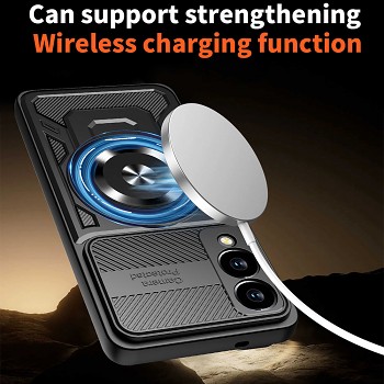 Integrovaný kovový kroužek na zadní straně slouží jako praktický stojánek pro pohodlné sledování obsahu a zároveň jako bezpečný úchyt pro stabilnější držení telefonu. Tento kroužek je plně otočný o 360 stupňů a umožňuje nastavení úhlu v rozsahu 0-150 stupňů, což zajišťuje maximální flexibilitu. Díky kovovému provedení je pouzdro kompatibilní s magnetickými držáky, což usnadňuje jeho použití například v automobilu. Pouzdro je navrženo tak, aby podporovalo bezdrátové nabíjení, aniž by bylo nutné jej sundávat. Vnitřní strana pouzdra je opatřena speciálním vzorem pro efektivní odvod tepla, čímž pomáhá udržovat optimální teplotu zařízení.