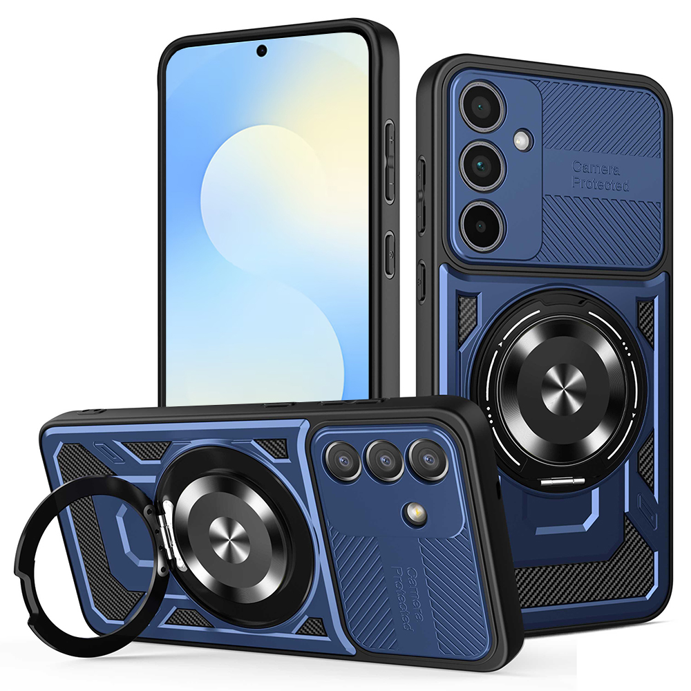 Kryt Techsuit RuggedCam se pyšní dvouvrstvou konstrukcí, která kombinuje pevný polykarbonát s pružným TPU materiálem pro maximální absorpci nárazů. Jeho dynamický design v modré barvě s černými akcenty a texturovanými prvky, včetně imitace karbonových vláken, dodává telefonu moderní a sportovní vzhled. Zvláštní pozornost byla věnována ochraně fotoaparátu – integrovaný posuvný kryt objektivu zajišťuje, že vaše čočky zůstanou bez škrábanců a prachu, zatímco vyvýšené okraje poskytují dodatečnou bezpečnost. Na zadní straně naleznete integrovaný kovový kroužek, který slouží jako praktický stojánek pro sledování obsahu nebo jako bezpečný úchyt pro pohodlné držení telefonu. Tento kroužek je navíc kompatibilní s magnetickými držáky do auta, což zvyšuje jeho funkčnost.