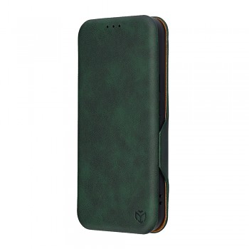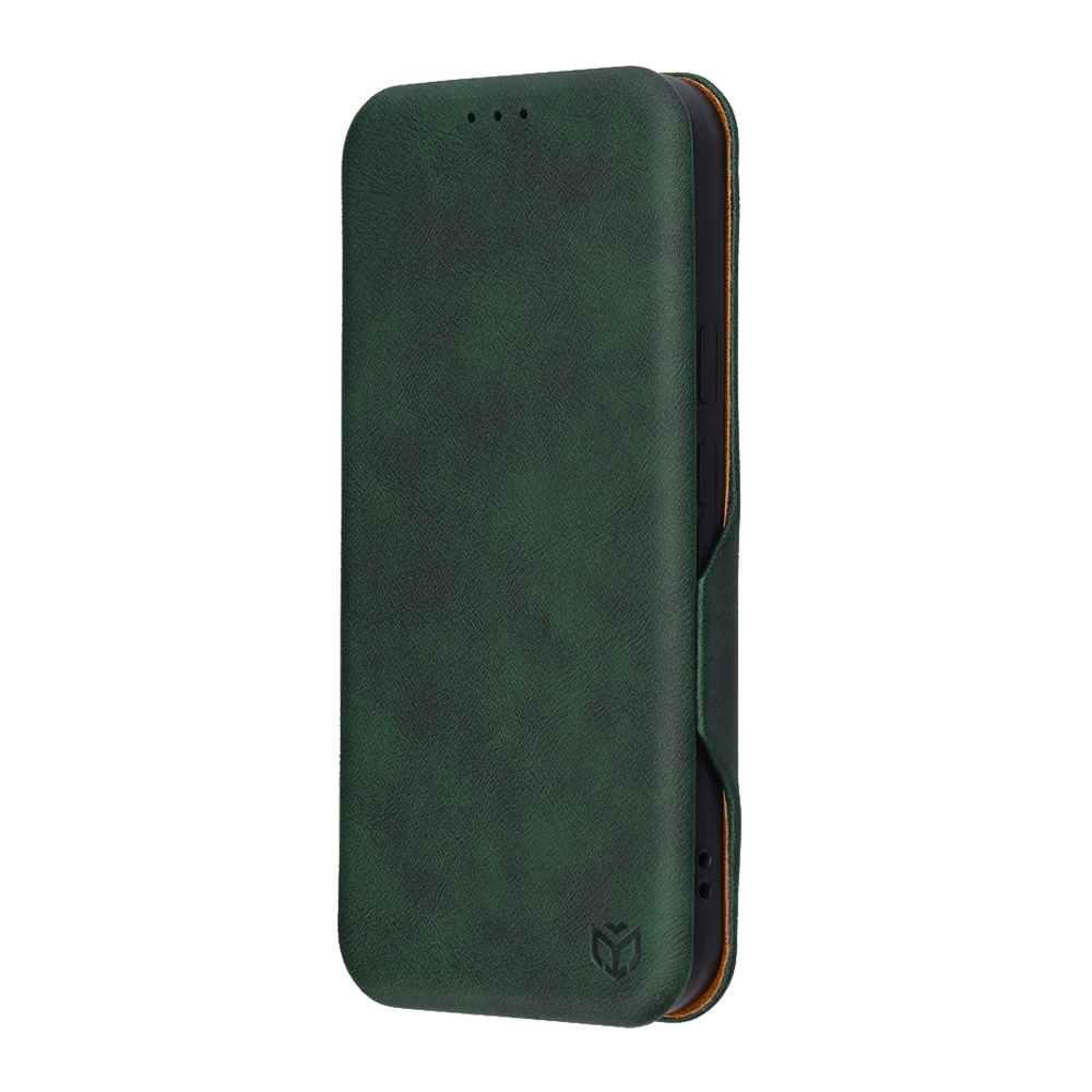 Pouzdro Techsuit Safe Wallet Plus se pyšní nadčasovým designem s texturou připomínající broušenou kůži, která mu dodává luxusní a zároveň odolný vzhled. Sytě zelený odstín je elegantní a univerzální, doplněný o decentní logo značky Techsuit v dolní části přední strany. Pouzdro je typu "peněženka", což znamená, že chrání telefon ze všech stran a disponuje přední odklápěcí částí. Na horní straně přední klopy jsou viditelné tři malé otvory, které umožňují pohodlné telefonování i se zavřeným pouzdrem. Vnitřní strana pouzdra je navržena tak, aby bezpečně držela telefon a zároveň poskytovala praktické přihrádky na karty nebo bankovky, čímž efektivně nahrazuje klasickou peněženku. Precizní výřezy zajišťují snadný přístup ke všem portům, tlačítkům a fotoaparátu, aniž by bylo nutné telefon z pouzdra vyjímat.