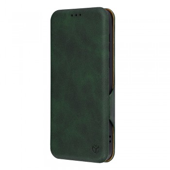 Pouzdro Techsuit Safe Wallet Plus pro Huawei Pura 70 v elegantní zelené barvě se pyšní sofistikovaným vzhledem s jemnou texturou, která připomíná broušenou kůži a dodává mu nádech vintage stylu. Vnější strana je v sytě tmavě zeleném odstínu, zatímco vnitřní část pouzdra je vyvedena v kontrastní hnědé/béžové barvě, což podtrhuje jeho prémiový charakter. Precizní zlatavé/béžové lemování podél okrajů a hřbetu pouzdra dodává celkovému designu luxusní akcent.