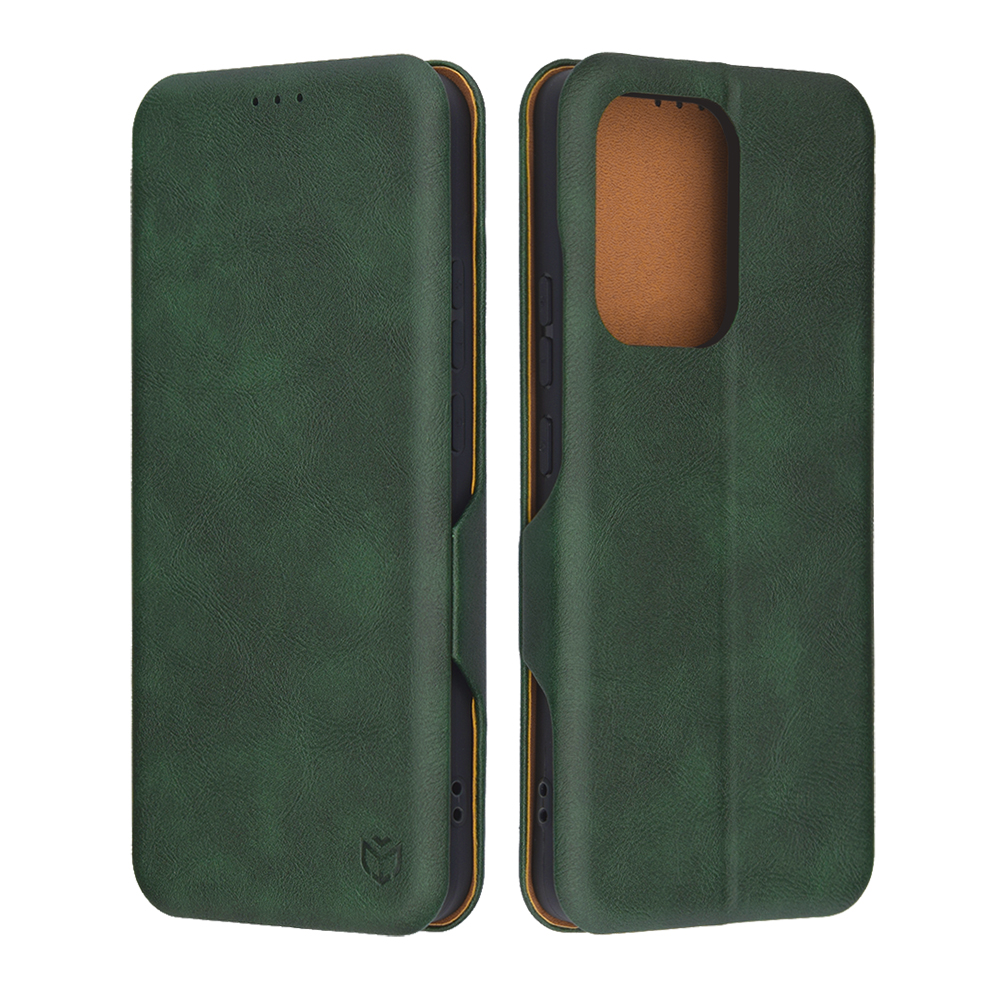 Pouzdro Techsuit Safe Wallet Plus v elegantní tmavě zelené barvě se pyšní sofistikovaným designem s jemnou texturou, která připomíná broušenou kůži a dodává mu luxusní vzhled. Jeho flipové provedení chrání displej telefonu před poškrábáním a nárazy, zatímco precizní výřezy zajišťují plný přístup ke všem portům a fotoaparátu. Vnitřní strana pouzdra je navržena s ohledem na praktičnost a nabízí integrované sloty pro karty, což z něj činí ideální řešení pro ty, kteří chtějí mít vše důležité pohromadě. Kontrastní zlatavý/oranžový lem po obvodu dodává pouzdru moderní a stylový akcent.