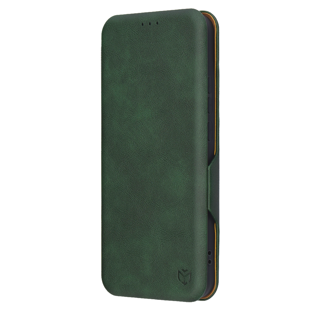 Pouzdro je vyrobeno z kvalitního materiálu s jemnou texturou, která připomíná broušenou kůži, a dodává mu tak luxusní vzhled a příjemný pocit na dotek. Precizní zpracování zajišťuje dokonalé obepnutí telefonu a spolehlivou ochranu proti poškrábání, pádům a nečistotám. Na přední straně pouzdra naleznete decentní embosované logo značky Techsuit, které podtrhuje jeho originalitu. Tři malé perforace na přední klopě umožňují pohodlné telefonování i se zavřeným pouzdrem, zatímco magnetické zavírání spolehlivě drží klopu na místě.