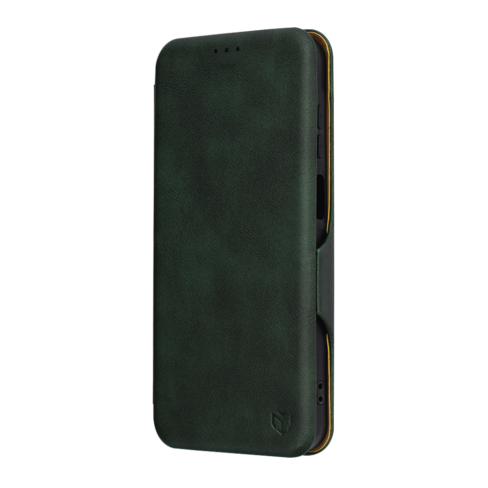 Pouzdro Techsuit Safe Wallet Plus se pyšní texturovaným povrchem, který imituje kůži a dodává mu prémiový vzhled i příjemný pocit na dotek. Jeho zelený exteriér je doplněn o kontrastní, světlejší vnitřní stranu, pravděpodobně v odstínu hnědé nebo béžové, což vytváří stylový a moderní dojem. Pouzdro je navrženo jako peněženkové, což znamená, že chrání telefon ze všech stran a zároveň nabízí praktické přihrádky na karty uvnitř přední klopy. Díky integrovanému magnetu zůstává pouzdro bezpečně zavřené. Jednou z klíčových vlastností je také možnost složit pouzdro do praktického stojánku, ideálního pro sledování videí nebo videohovory.