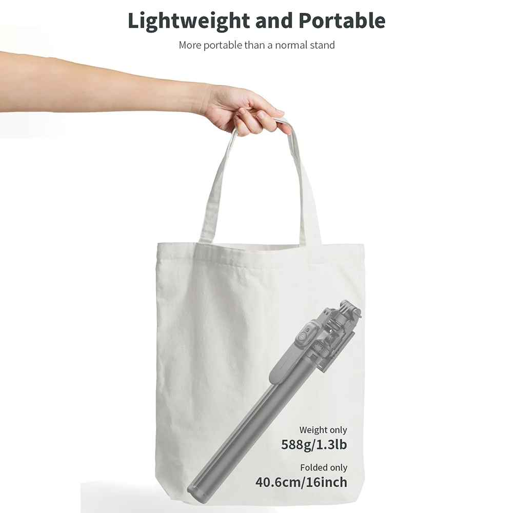 Hlava stativu nabízí 360° rotaci, což umožňuje snadné přepínání mezi režimy na výšku a na šířku a precizní nastavení úhlu pro každý záběr. K ovládání slouží odnímatelný Bluetooth dálkový ovladač, který zajišťuje pohodlné spouštění závěrky bez nutnosti dotyku telefonu. Multifunkční odnímatelná hlava je vybavena čtyřmi rozšiřujícími porty, včetně 1/4" šroubů a cold shoe patice, což umožňuje připojení dalšího příslušenství, jako jsou externí mikrofony nebo přídavná světla. S hmotností pouhých 588 g a složenou délkou 40,6 cm je tento stativ mimořádně lehký a přenosný, ideální pro každodenní nošení.