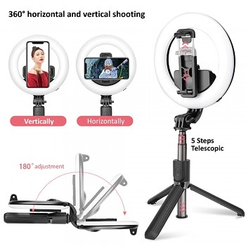 Model L07 se pyšní moderním a minimalistickým designem v elegantní černé barvě. Jeho největší předností je skládací konstrukce, která umožňuje snadné složení do kompaktních rozměrů pouhých 19 cm, což z něj činí ideálního společníka na cesty, který se bez problémů vejde do batohu či kabelky. Rozložený stativ s teleskopickou tyčí dosahuje úctyhodné délky až 90 cm, což vám poskytne dostatečný dosah pro širokoúhlé záběry nebo skupinové fotografie. Integrované kruhové světlo o průměru 5 palců je elegantně zakomponováno do konstrukce a zajišťuje rovnoměrné osvětlení.