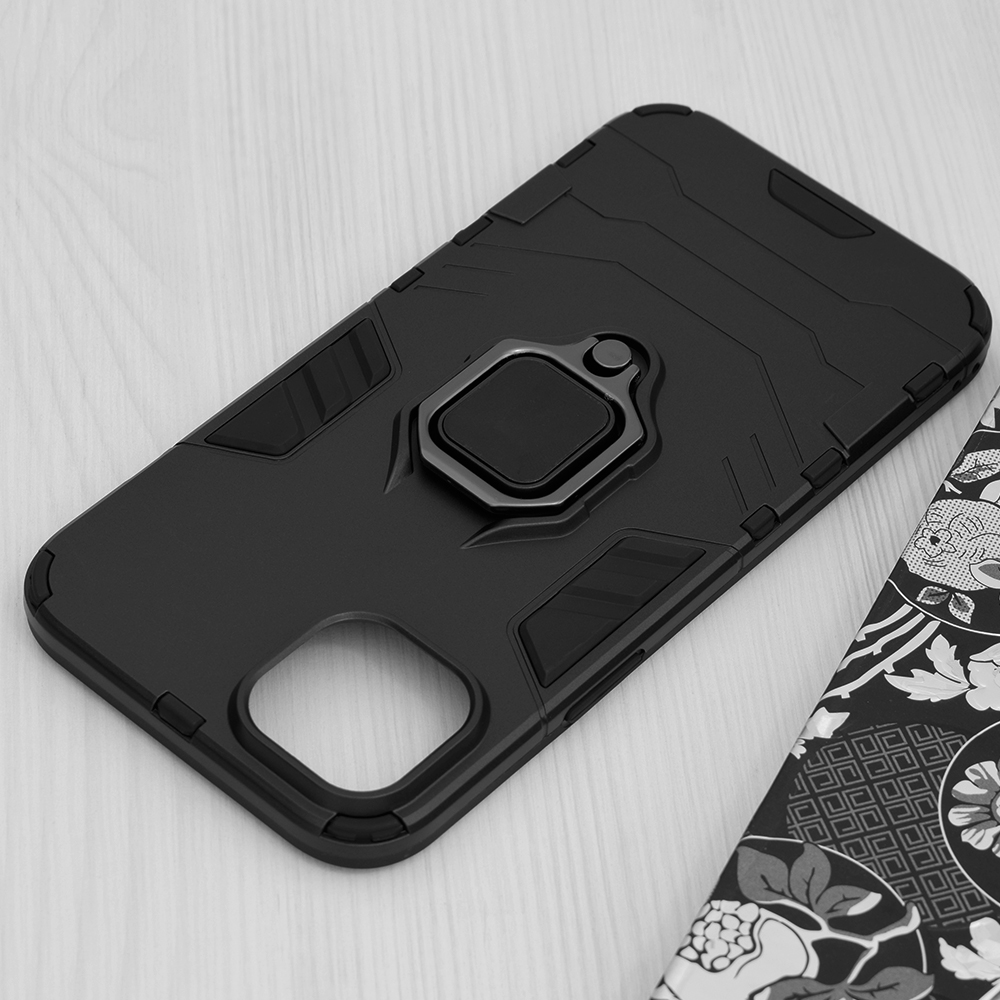 Design pouzdra je navržen s důrazem na maximální odolnost a funkčnost. Černé provedení dodává elegantní a zároveň robustní vzhled. Zadní strana pouzdra je opatřena texturovaným povrchem, který zlepšuje úchop a minimalizuje riziko vyklouznutí z ruky. Integrovaný kovový kroužek slouží jako praktický stojánek pro pohodlné sledování obsahu nebo jako bezpečný úchyt pro prst. Pouzdro má zesílené rohy, které efektivně absorbují nárazy a chrání telefon před poškozením při pádech. Přesné výřezy pro fotoaparát, konektory a reproduktory zajišťují plnou funkčnost zařízení bez nutnosti pouzdro sundávat.
