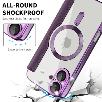 Zadní část pouzdra je průhledná, což umožňuje vyniknout originálnímu designu vašeho iPhone 16 Plus. Její dominantou je integrovaný magnetický kruh a vertikální proužek v lesklém fialovém provedení, které nejenže dodávají pouzdru moderní vzhled, ale také zajišťují kompatibilitu s MagSafe příslušenstvím. Fialové kovové akcenty kolem modulu fotoaparátu a na okrajích pouzdra dokonale doplňují celkový design a podtrhují jeho luxusní vzhled.