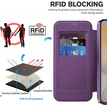 Toto elegantní knížkové pouzdro v atraktivní fialové barvě je navrženo tak, aby dokonale doplnilo váš Samsung Galaxy S23 FE. Vnější strana pouzdra je vyrobena z kvalitní syntetické kůže s jemnou texturou, která je příjemná na dotek a zároveň odolná proti každodennímu opotřebení. Precizní šití podél okrajů dodává pouzdru luxusní vzhled a zvyšuje jeho odolnost.