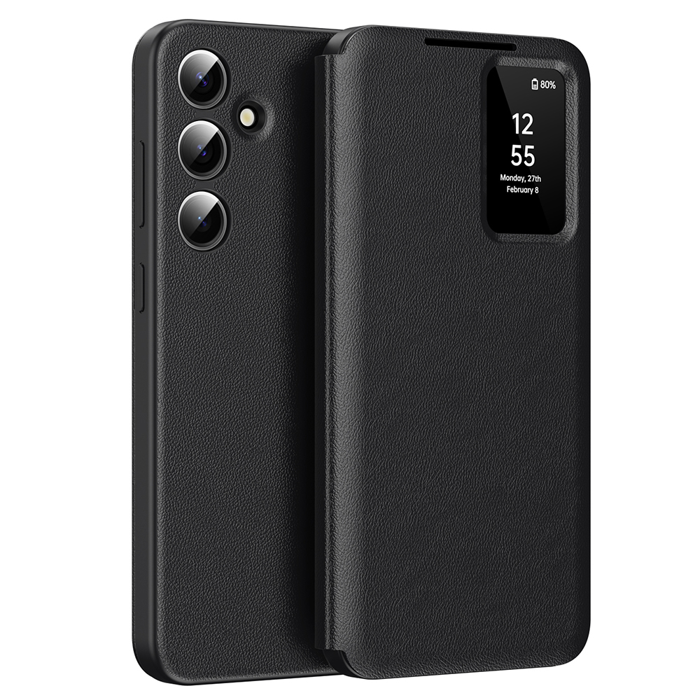 Pouzdro Techsuit SmartView Series se pyšní minimalistickým a zároveň luxusním vzhledem v klasické černé barvě. Jeho povrch je opatřen jemnou texturou připomínající kůži, která zajišťuje příjemný úchop a odolnost proti otiskům prstů. Klíčovým prvkem je průhledné okénko na přední straně, které umožňuje rychlý a pohodlný přístup k důležitým informacím, jako je čas, datum a stav baterie, aniž byste museli pouzdro otevírat. Zadní strana pouzdra je precizně navržena s dokonalými výřezy pro trojitý fotoaparát a blesk, což zaručuje neomezené fotografování a plnou funkčnost zařízení. Celkový design podtrhuje tenký profil, který zbytečně nezvětšuje objem telefonu a zachovává jeho elegantní linie.