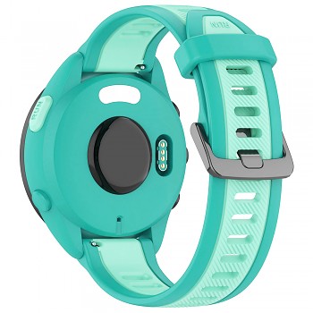 Řemínek se pyšní moderním a sportovním designem, který okamžitě upoutá pozornost. Je vyroben z vysoce kvalitního silikonu, který je příjemný na dotek, odolný vůči potu a vodě, a zároveň zaručuje dlouhou životnost. Jeho dvoubarevné provedení v odstínech tyrkysové a světlejší mintové barvy dodává řemínku dynamický vzhled. Vnitřní strana řemínku je opatřena texturovaným vzorem a perforacemi, které zajišťují lepší prodyšnost a zabraňují hromadění vlhkosti pod řemínkem, což oceníte zejména při intenzivním pohybu. Klasická spona v elegantní tmavé barvě pak zaručuje bezpečné a snadné zapínání.