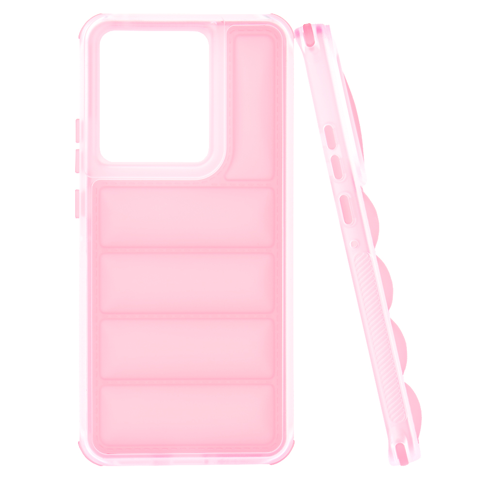 Pouzdro Techsuit Wave Shield v jemné růžové barvě je navrženo s důrazem na moderní estetiku a ergonomii. Jeho zadní strana je charakteristická horizontálními vlnitými prolisy, které nejenže dodávají pouzdru jedinečný vzhled připomínající prošívanou bundu, ale také zlepšují úchop a minimalizují riziko vyklouznutí telefonu z ruky. Materiál je poloprůhledný, což umožňuje decentně prosvítat původní barvě a designu vašeho zařízení, zatímco logo Motorola zůstává viditelné. Pouzdro je vyrobeno z kvalitního, pružného materiálu, který efektivně absorbuje nárazy a chrání telefon před poškrábáním a pády. Zvýšené okraje kolem displeje a modulu fotoaparátu poskytují extra ochranu proti přímému kontaktu s povrchem.