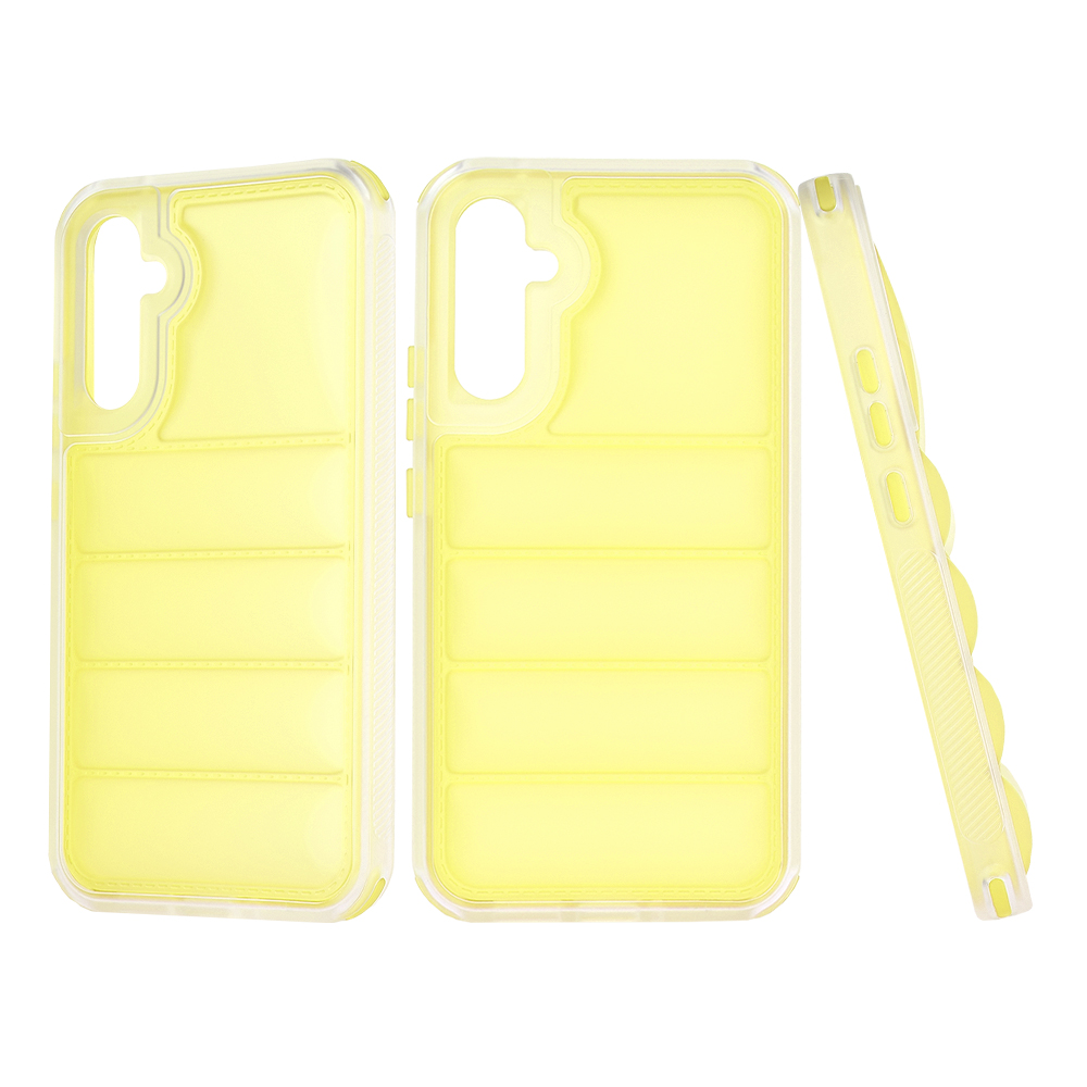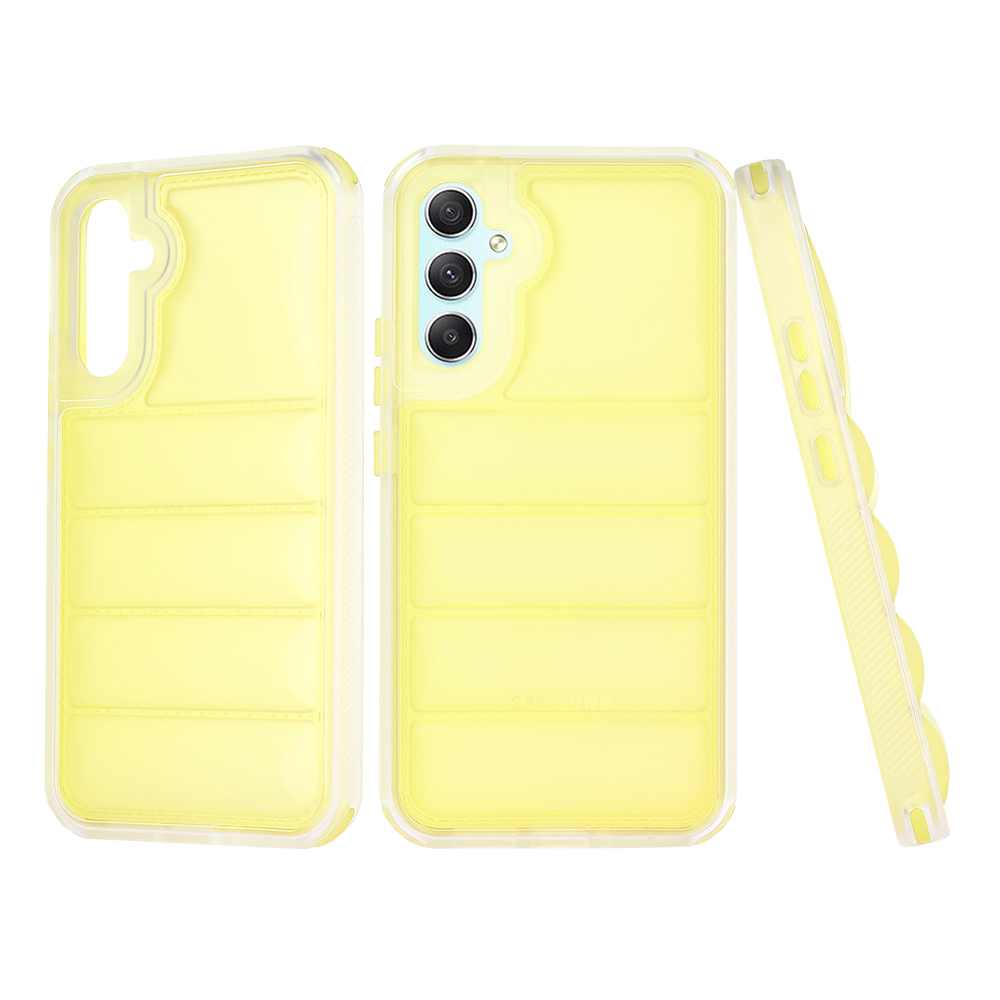 Kryt Techsuit Wave Shield se pyšní unikátním designem inspirovaným vlnami nebo prošívanou bundou. Jeho zadní strana je zdobena horizontálními, mírně vystouplými pruhy, které nejenže dodávají telefonu moderní a dynamický vzhled, ale také zlepšují úchop a minimalizují riziko vyklouznutí z ruky. Průsvitná žlutá barva propůjčuje vašemu zařízení svěží a energický nádech. Přesné výřezy pro fotoaparáty, konektory a reproduktory zajišťují plnou funkčnost telefonu bez jakéhokoli omezení, zatímco tlačítka si zachovávají jistý a příjemný stisk.