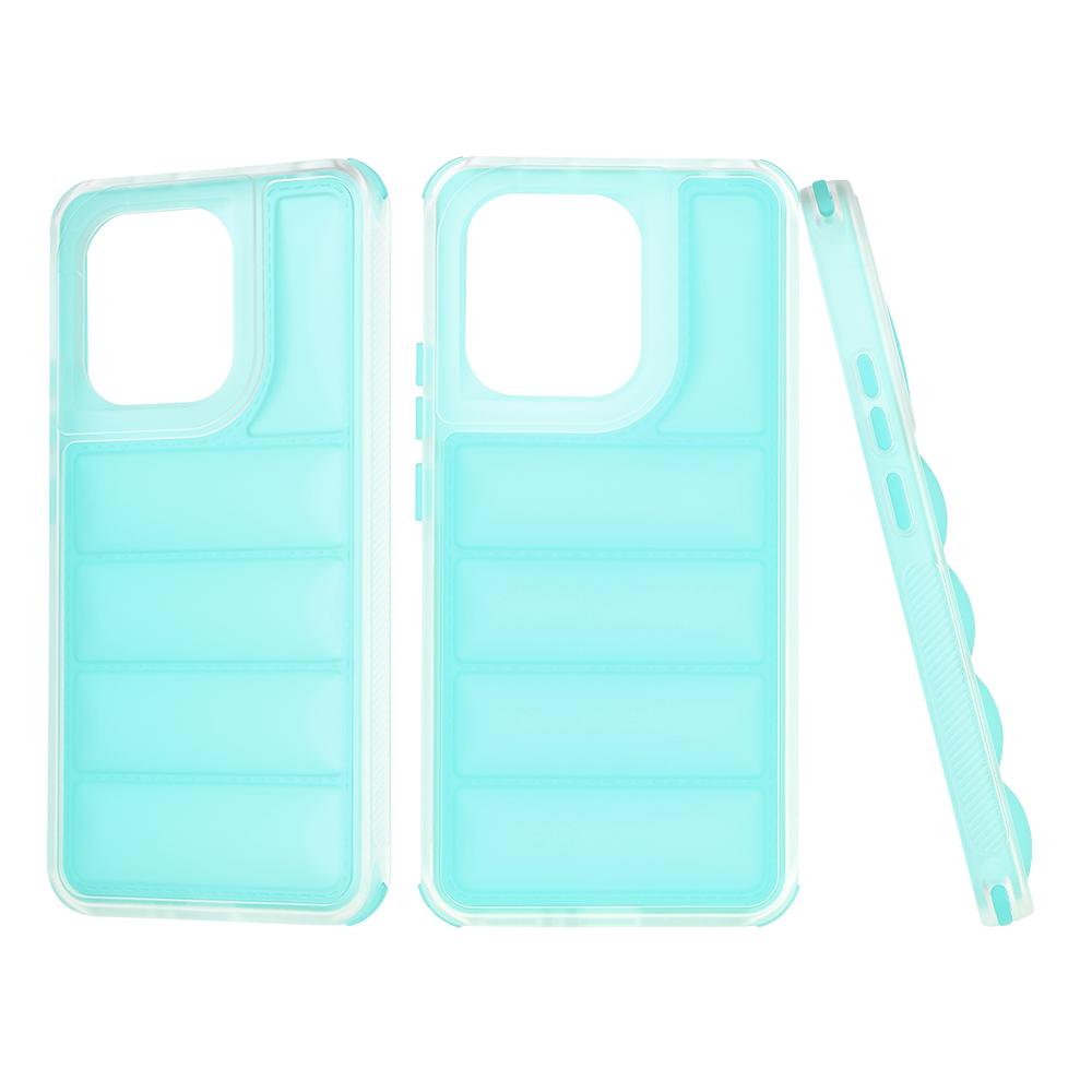 Pouzdro Techsuit Wave Shield se pyšní unikátním designem, který připomíná jemné vlny nebo prošívanou bundu. Jeho zadní strana je tvořena horizontálními, mírně vystouplými segmenty, které nejenže dodávají pouzdru moderní a hravý vzhled, ale také zlepšují úchop a minimalizují riziko vyklouznutí z ruky. Poloprůhledný tyrkysový odstín podtrhuje originalitu a umožňuje prosvítat původní barvě telefonu, zatímco precizní výřezy pro fotoaparát a tlačítka zajišťují plnou funkčnost bez kompromisů. Boční strany jsou hladké a ergonomicky tvarované pro pohodlné držení.