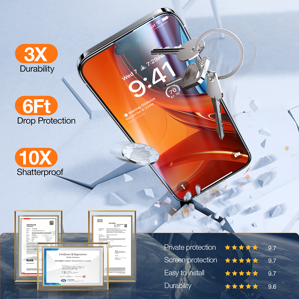 Design skla GlassGo Epic Privacy je minimalistický a precizní, dokonale kopírující křivky displeje iPhone 15 Pro Max. Jeho tenký profil zajišťuje, že telefon si zachová svůj původní vzhled a citlivost dotyku. Vyrobeno z hlinitokřemičitého skla (Lithium Aluminosilicate) nebo tvrzeného skla 9H+, toto ochranné sklo nabízí bezkonkurenční odolnost proti poškrábání, prasklinám a nárazům, čímž prodlužuje životnost vašeho drahocenného zařízení.
