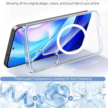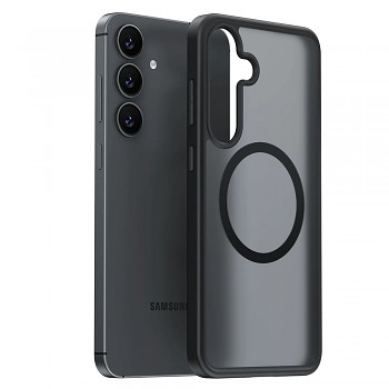 Pouzdro Torras Guardian Magnetic Series se vyznačuje poloprůhledným zadním panelem s matným povrchem, který decentně odhaluje krásu vašeho Samsung Galaxy S25, zatímco pevné černé okraje dodávají krytu robustní vzhled a jistý úchop. Integrovaný magnetický kruh na zadní straně zajišťuje plnou kompatibilitu s MagSafe příslušenstvím, což umožňuje rychlé a stabilní bezdrátové nabíjení a snadné připojení dalších MagSafe doplňků.